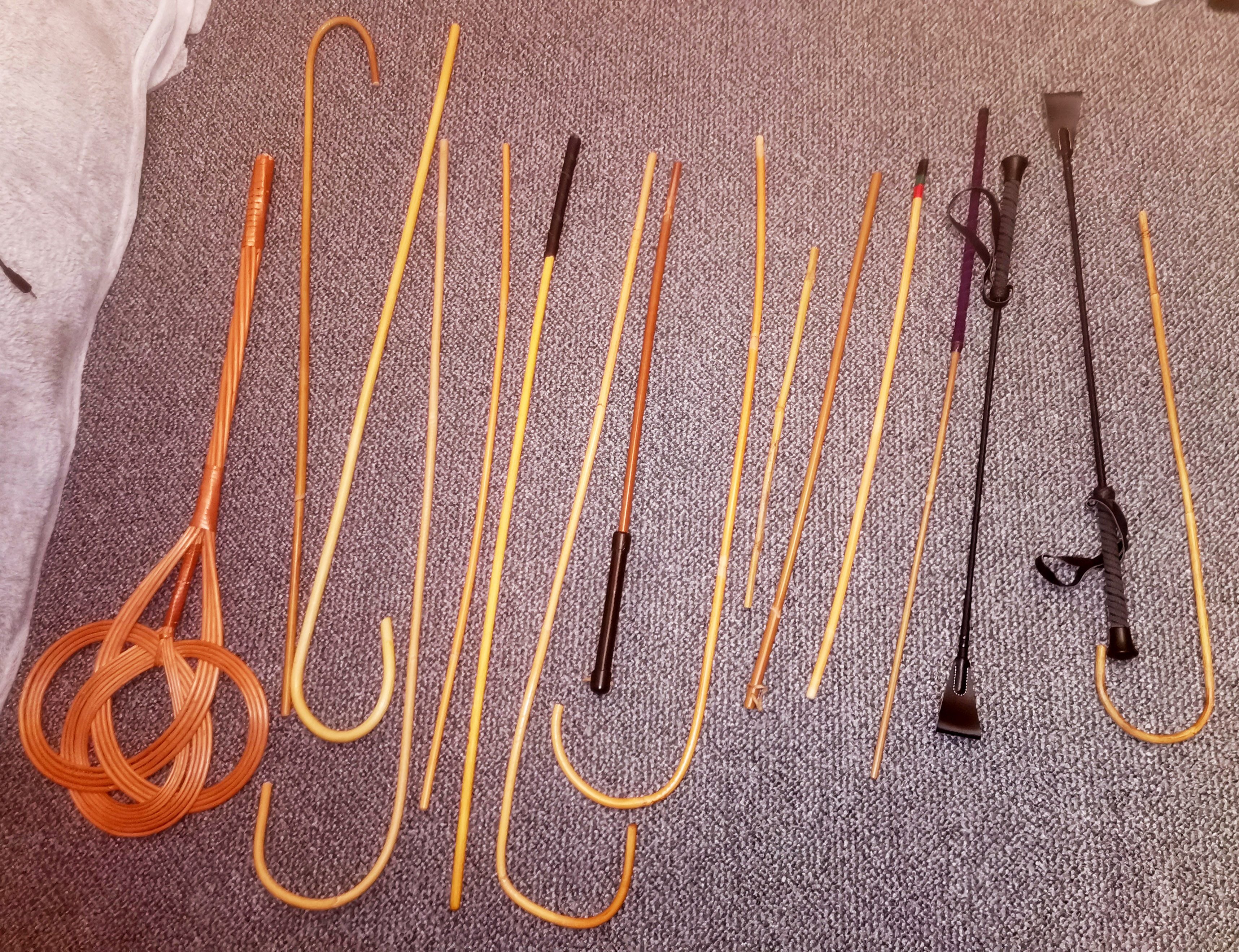 I have Quality Control, London Tanners and Ouch products in the collection. The Canes are Dragon, Kooboo, Rattan, plus a special mixed wood Conni cane, and they are Junior and Senior sizes. There are rubber and leather sole slippers as well as heavy gym ones, wooden implements of different thicknesses and leather paddles and straps for all levels from fun play to severe: