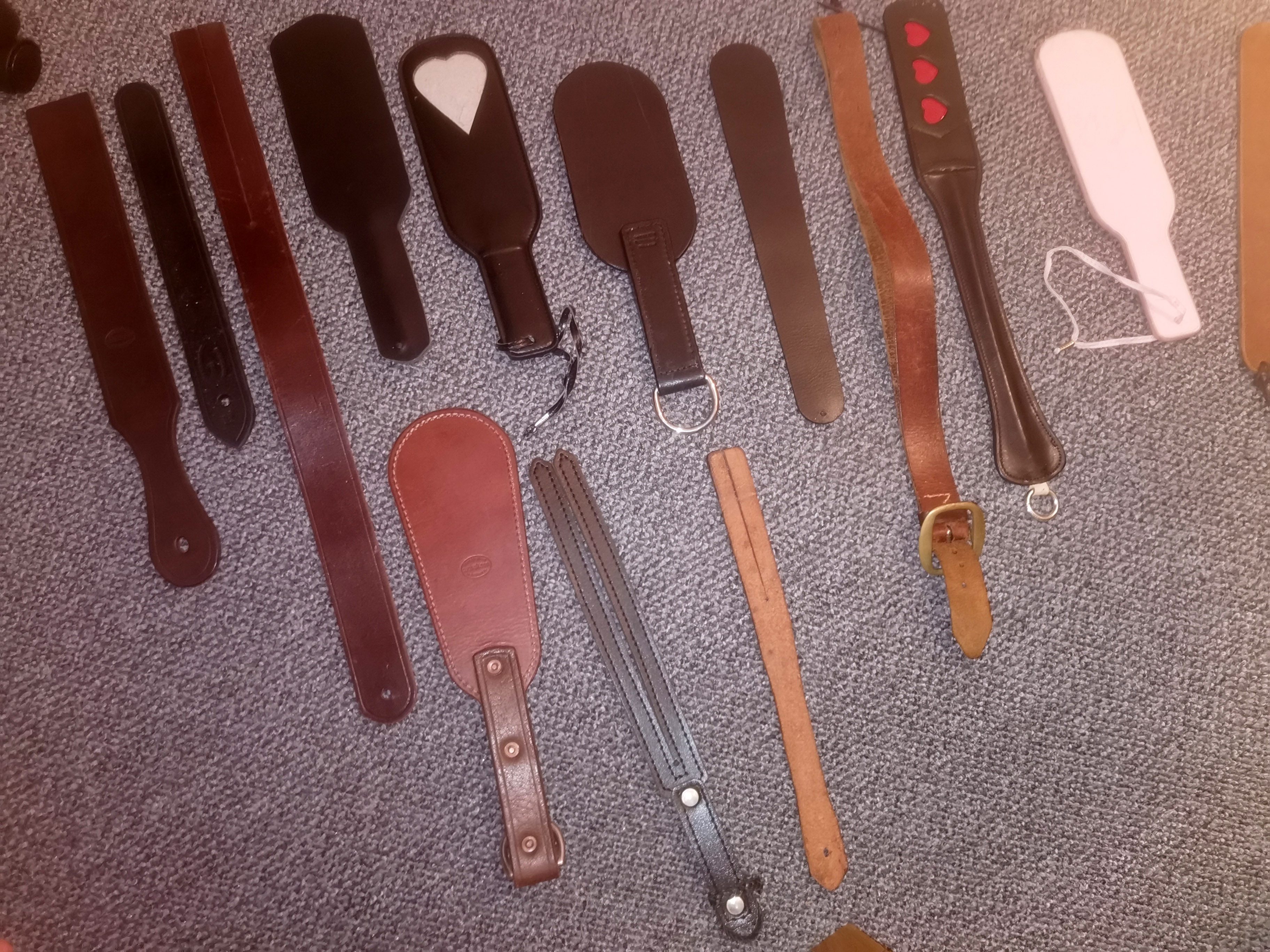 I have lots of spanking implements at home that have either been left with me, passed on, or bought as presents at events such as the BBB (Birmingham Bizarre Bazaar) , the LAM (London Alternative Market) or at other parties in the UK and US. I think I have enough to cater for most spankos, although it’s always nice if people have their own because it at least shows they have some knowledge of them, and hopefully how to use them! I know lots of experienced Doms and Tops will definitely have their own, because it’s a personal thing and I prefer to be with people in this category because some are one step ahead of me and will naturally take charge 🙂